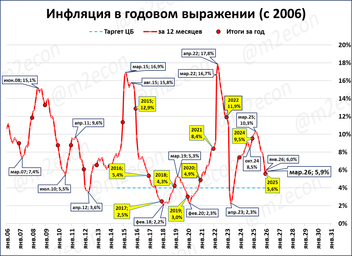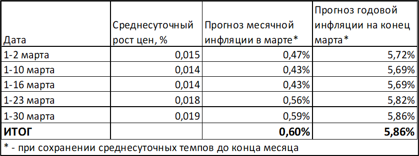 По итогам марта инфляция составила 5,86% годовых. Это ниже чем в феврале (5,91%).