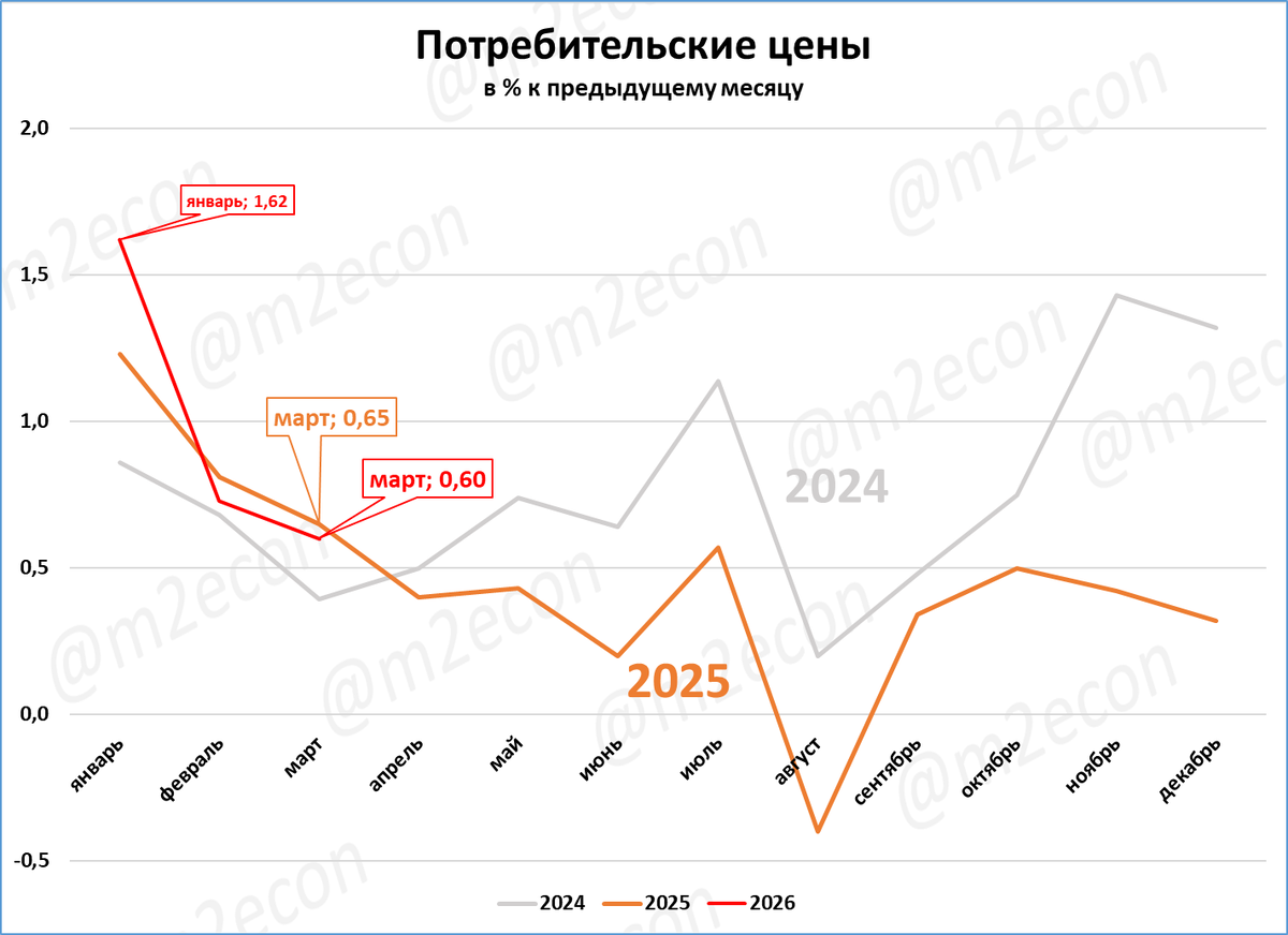 Инфляция в марте (0,60) ниже, чем в марте прошлого 2025 года (0,65).