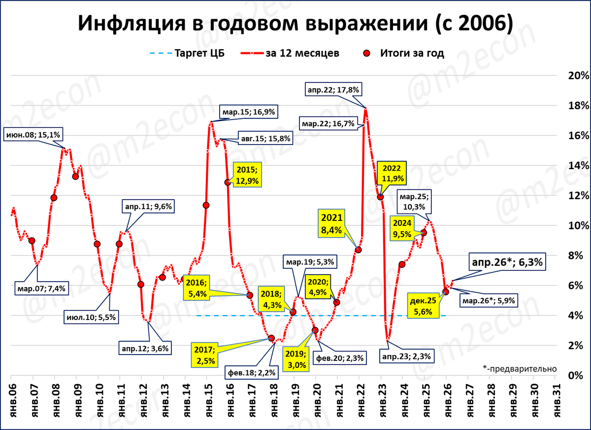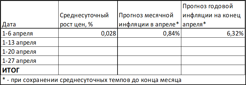 Если такой темп сохранится до конца месяца, то по итогам апреля инфляция вырастет до 6,32% годовых (по итогам марта 5,9%).