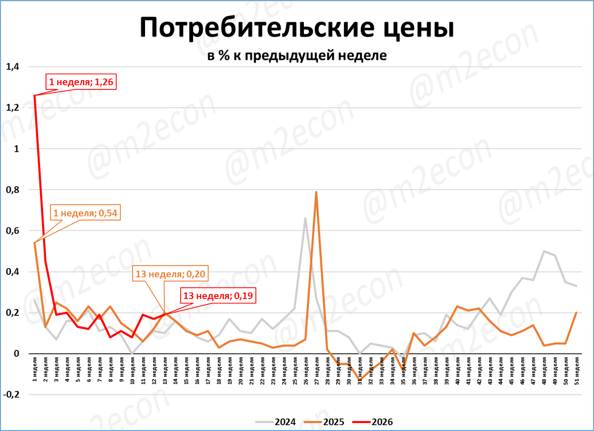 Недельный рост цен (0,19% за 13 неделю) ниже, чем в прошлом году (0,20% за 13 неделю 2025 года).