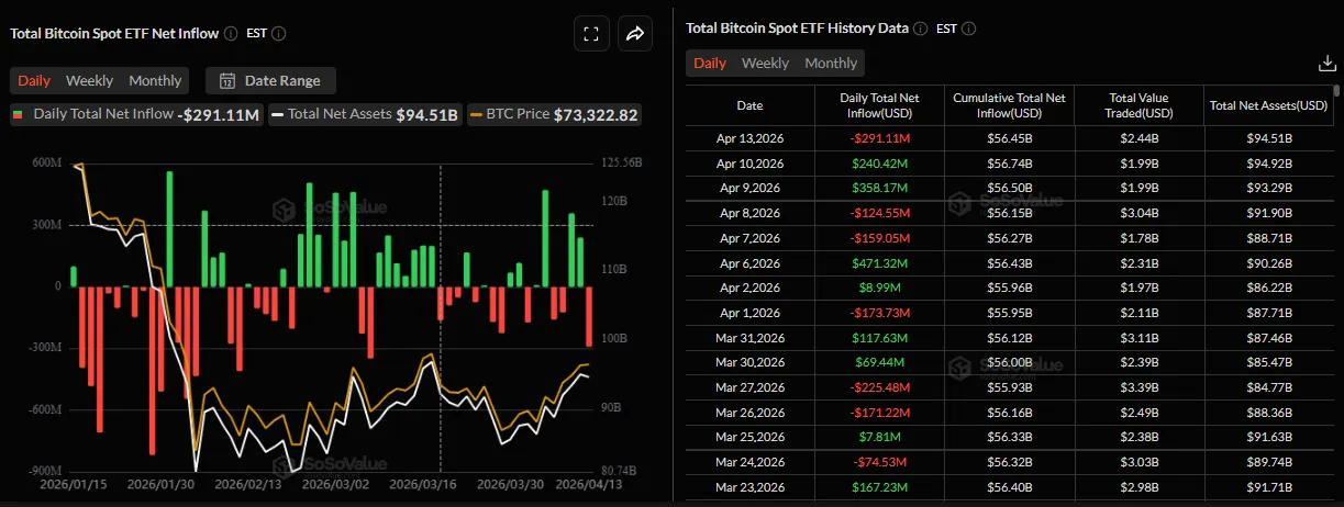 Несмотря на восстановление курса, 13 апреля спотовые ETF на основе первой криптовалюты зафиксировали отток $291 млн. Ethereum-фонды привлекли незначительные $9 млн