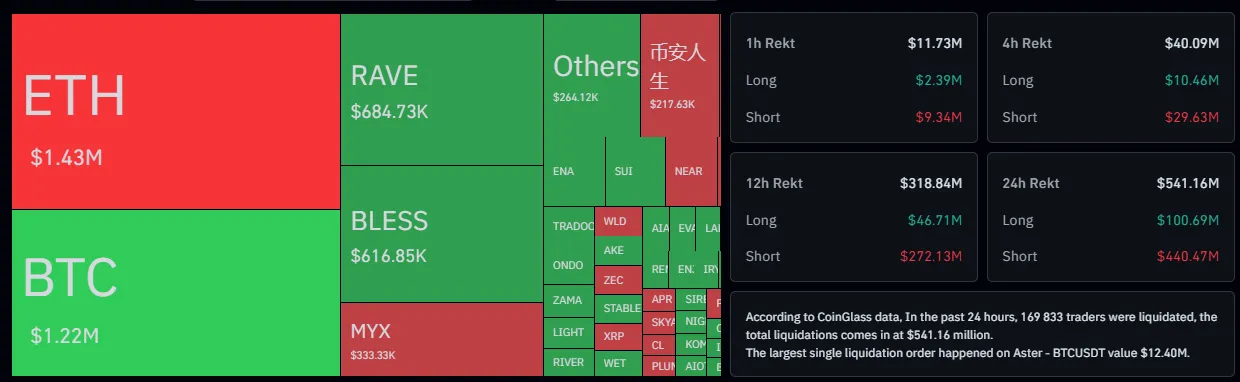По данным Coinglass, за прошедшие 24 часа принудительно закрылись шорты на общую сумму $440 млн