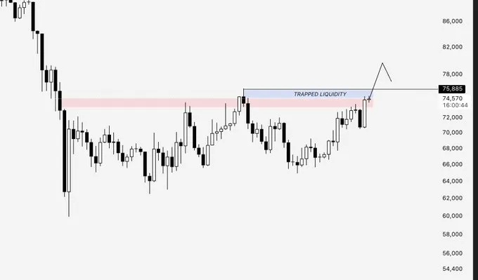 Ряд наблюдателей указали на большие объемы ликвидаций коротких позиций, особенно в зоне у $73 500. Следующий большой кластер ликвидности находится на уровне $75 500.