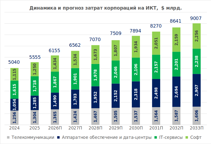 Исследователи Gartner оценили объем глобального рынка ИКТ (информационных и телекоммуникационных технологий) в 2025 году в $5,555 трлн. Темпы прироста рынка в прошлом году составили 10,3%, а в 2026 году прогнозируется их увеличение до 10,8%. Сам же рынок достигнет величины $6,155 трлн. С учетом новых данных Gartner, мы продлили наши прогнозы до 2033 года и ожидаем, что к этому моменту объем глобального рынка ИКТ составит $9,007 трлн., а рубеж в $7 трлн будет пробит не в 2029 году, а уже в 2028 году. При этом средние темпы прироста рынка ИКТ до 2033 года в нашем прогнозе составляют лишь 6,2%, что делает этот прогноз относительно консервативным, несмотря на внушительные абсолютные величины.
