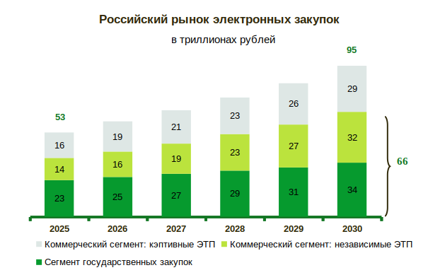 Полный объем рынка госзакупок и коммерческих закупок в цифровой форме составил в 2025 году 53 трлн руб. и к 2030 году достигнет почти 95 трлн руб. За вычетом оборота кэптивных торговых площадок и B2B-маркетплейсов, сегмент, который можно считать наиболее важным для прогноза выручки эмитента, составил в 2025 году 37 трлн руб. и к 2030 году достигнет 66 трлн руб.