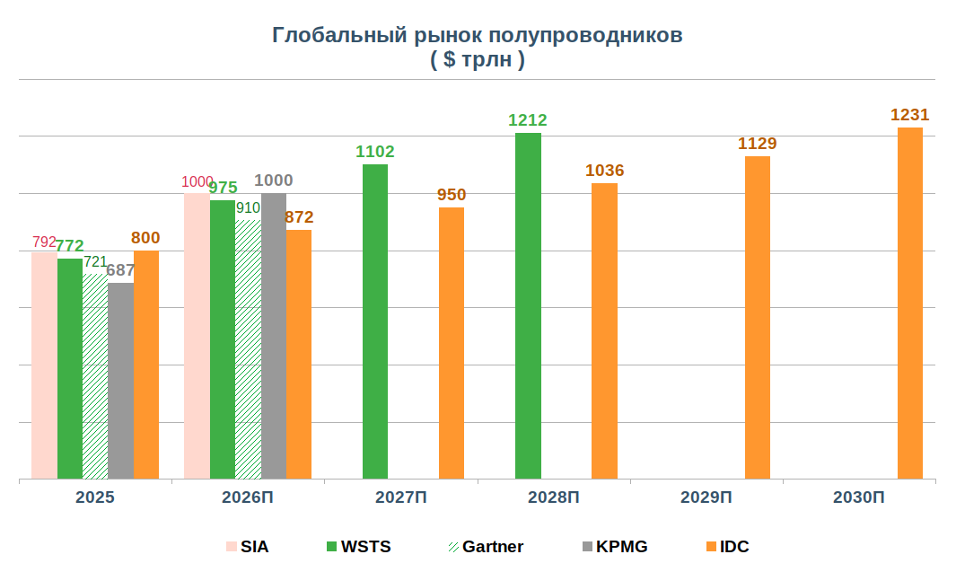По данным WSTS, в 2025 году объем мирового рынка полупроводников достиг $772 млрд (+23% (г/г)), что значительно превысило отраслевые ожидания. С учетом ускорения динамики WSTS повысила прогноз на 2026 год до $975 млрд (+26% (г/г)). Semiconductor Industry Association и KPMG считают, что рубеж в $1 трлн будет преодолен уже по итогам текущего года. А в 2030 году объем рынка составит от $1,2 трлн (оценка IDC) до $1,6 трлн (оценка BCC Research).