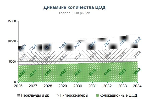 Количество традиционных (колокационных) дата-центров, размещающих стойки с серверами, которые арендуют пользователи, будет увеличиваться на 2,4% в год. Медленнее всего будет расти число гиперскейлеров ― крупных ЦОД, которые принадлежат лидирующим облачным операторам, таким как Amazon Web Services (AWS), Google Cloud, Microsoft Azure, Oracle и китайским операторам.
