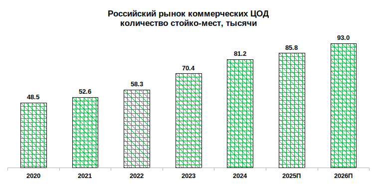 В iKS-Consulting ожидали, что по итогам 2025 года полное количество стойко-место в коммерческих ЦОД России в 2025 году составит 85,8 тыс. По нашему прогнозу, в 2026 году оно вырастет до 93 тыс. Однако аналитики J’Son & Partners считают подобные оценки вдвое заниженными. Они предлагают учитывать не только коммерческие ЦОД, но и собственные ЦОД маркетплейсов, финтеха и майнеров, что уже в 2025 году увеличивает полное количество стойко-мест в РФ до 180 тыс.