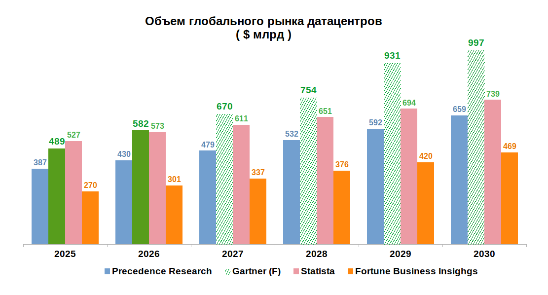 Прогнозы объема глобального рынка ЦОД до 2030 года в денежном выражении (в $ млрд) приведены на рисунке 4.
