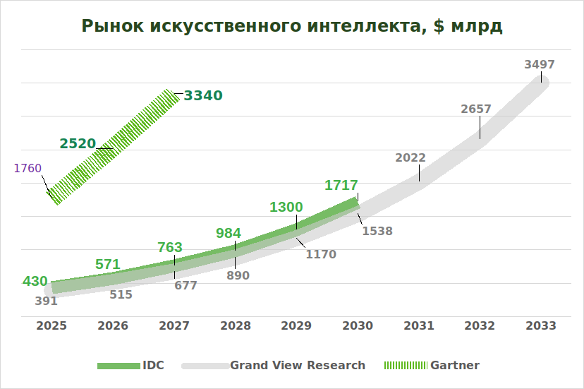 Хотя представления различных исследователей о текущем состоянии рынка искусственного интеллекта значительно расходятся, потенциал глобального рынка ИИ в среднесрочной перспективе большинство источников оценивает не менее чем в $3,3 трлн. Средние темпы прироста рынка (CAGR) до 2033 года исследователи Grand View Research оценивают в 30%, а аналитики Dimension Market Research ― в 38%. Эксперты департамента UNCTAD Организации Объединенных наций (UN Trade & Development) ожидают, что в 2033 году объем рынка ИИ составит $4,8 трлн, и он оставит далеко позади рынки электромобилей, интернета вещей и блокчейна. Треть всех расходов на IТ уже в ближайшие годы можно так или иначе связать с затратами на ИИ.