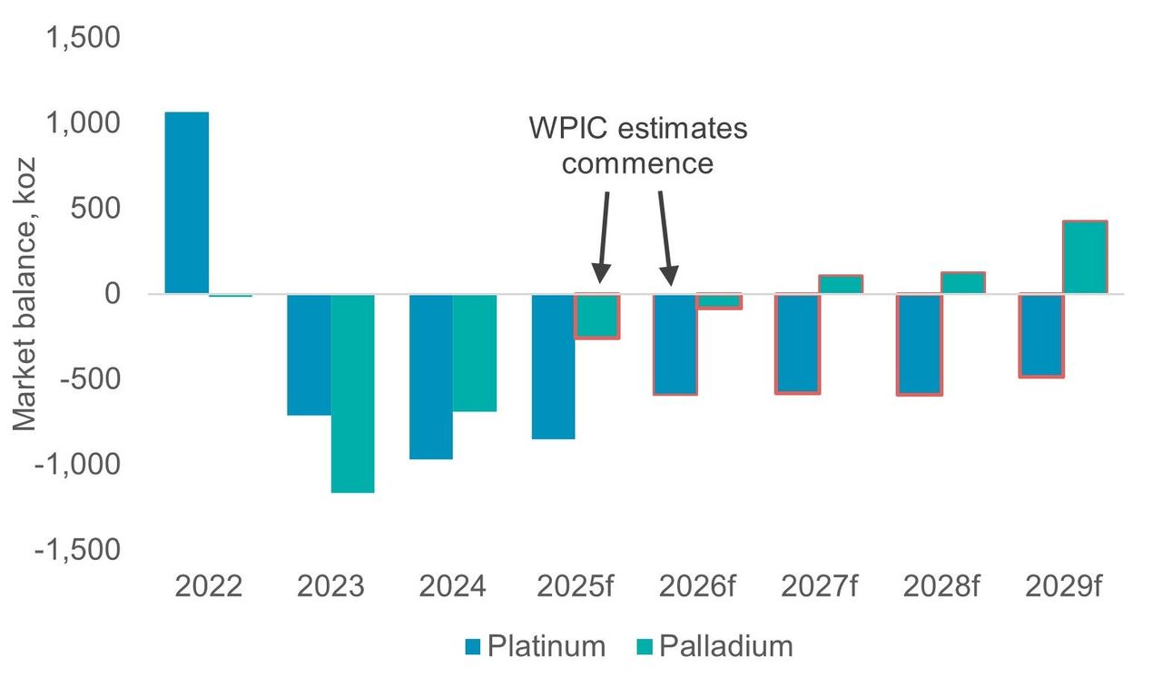 Так выглядит исторический и прогнозный баланс рынка платины и палладия (данные WPIC и Metals Focus):