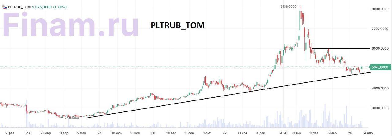 Среднесрочный график цен на платину говорит, что всплеск котировок в начале года ожидаемо был краткосрочной спекулятивной историей. В фазе последующей коррекции цена на платину ушла вниз. Соответственно, стоимость контракта PLTRUB нашла поддержку на линии растущего тренда в районе 4760 руб. В дальнейшем от этого рубежа возможно постепенно восстановление цен в район 6000 руб., где находится горизонтальный рубеж сопротивления.