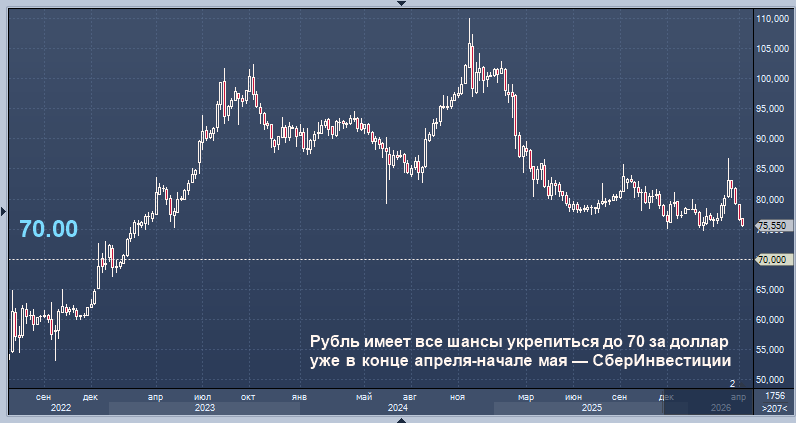 Рубль имеет все шансы укрепиться до 70 руб./$1 уже в конце апреля-начале мая, говорится в комментарии аналитиков "СберИнвестиций".