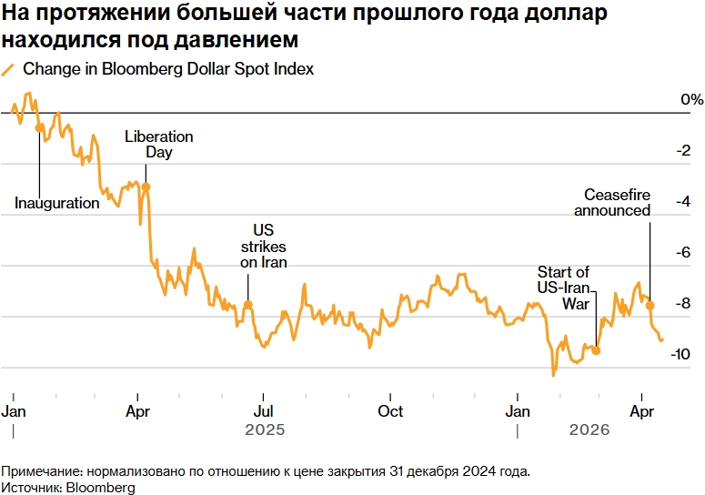После того как 7 апреля США и Иран достигли соглашения о перемирии, индекс доллара Bloomberg снизился примерно на 1,4%. Валюты, чувствительные к рискам, в частности, скандинавские, а также австралийский и новозеландский доллары, выросли примерно на 3% по отношению к американской валюте. Индекс S&P 500 в это время достиг новых рекордных максимумов.