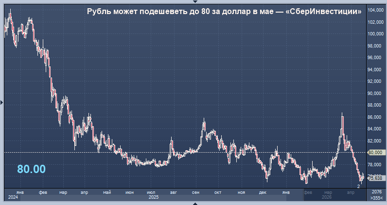 Рубль может подешеветь до 80 руб./$1 в мае, считают аналитики "СберИнвестиций".