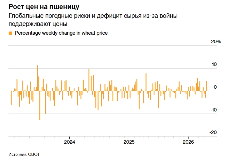На Чикагской товарной бирже контракты на пшеницу за неделю выросли почти на 5 %, что стало самым значительным скачком с февраля. Твердозерный озимый сорт продолжил расти и достиг самого высокого показателя с июня 2024 года.