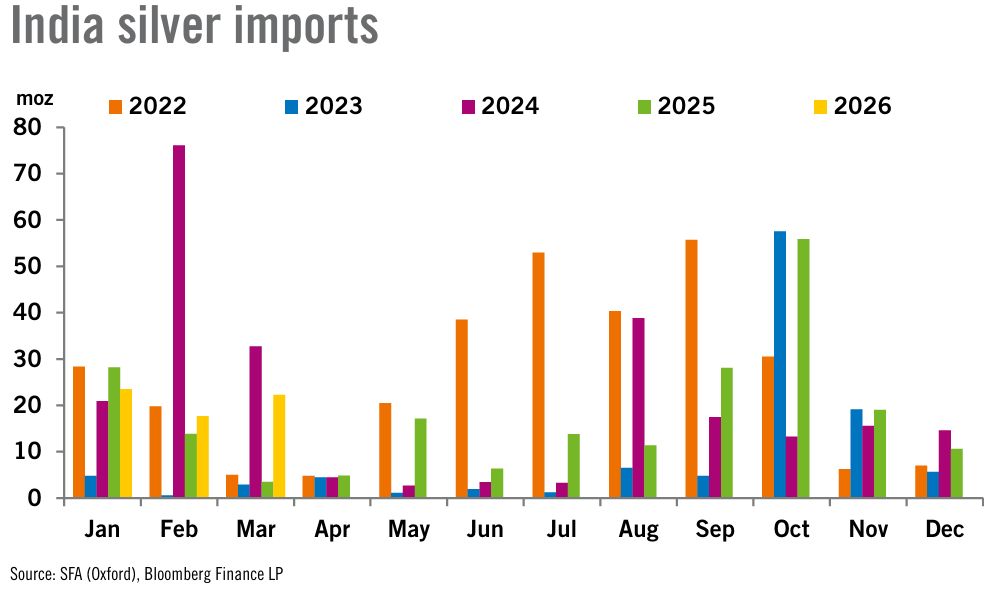 Спрос на серебро в Индии растёт как в денежном, так и в унционном выражении. Спрос на серебро в Индии значительно вырос в финансовом году, завершившемся в конце марта 2026 года. В прошлом финансовом году Индия импортировала 7 334,96 тонн (235,8 млн унций) серебра, что на 42% больше, чем годом ранее. Общая стоимость этого импорта выросла на 149,5% до $ 12,05 млрд. Это отражает высокий спрос со стороны Индии на драгоценные металлы как для инвестиционных целей (защита от инфляции), так и для изготовления ювелирных изделий.