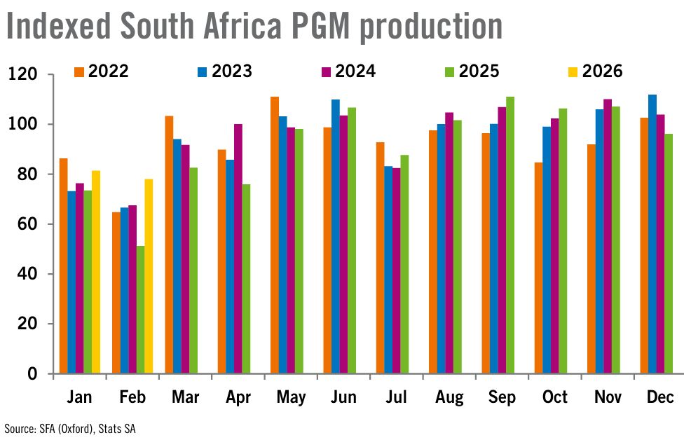 Производство платиновых металлов [#PGM] в Южной Африке в феврале достигло самого высокого уровня за несколько лет. Согласно последним данным Stats SA, объёмы производства PGM в Южной Африке в январе и феврале 2026 года превысили показатели 2025 года, при этом перебоев было меньше, чем в прошлом году. Ожидается также увеличение производства рафинированной #платины по сравнению с прошлым годом, поскольку Valterra перенесла ежегодное техническое обслуживание своих предприятий с первого квартала на третий квартал года.