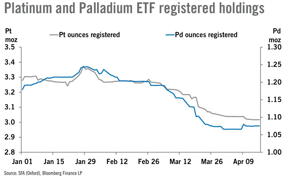 Отток средств из ETF, инвестирующих в #палладий, следует за оттоком из фондов, инвестирующих в платину. Общий объём унций, зарегистрированных в ETF, инвестирующих в палладий, достиг пика 30 января на уровне 1,24 млн унций. С тех пор наблюдался отток в размере 13,6%, в результате чего осталось 1,08 млн унций. Это означает снижение на 8,2% с начала года по 16 апреля. Аналогично платине, этот отток помогает смягчить рыночный дефицит и снизить ставки аренды.