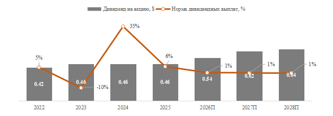 Micron с 2022 г. стабильно выплачивает дивиденды, однако размер выплат пока остается умеренным. В 2022 г. компания выплатила около $0,42 на акцию, а в 2023–2025 гг. выплаты составляли по $0,46 на акцию в год. Отрицательное значение нормы дивидендных выплат в 2023 г. объясняется не снижением самих дивидендов, а убытком на уровне прибыли на акцию. Основной причиной стало резкое ухудшение конъюнктуры на рынке памяти, компания прямо указывала на сложную ситуацию в отрасли, слабый спрос и меры по сокращению предложения и затрат, а в 2К 2023 г. дополнительно признала списание запасов на $1,43 млрд.