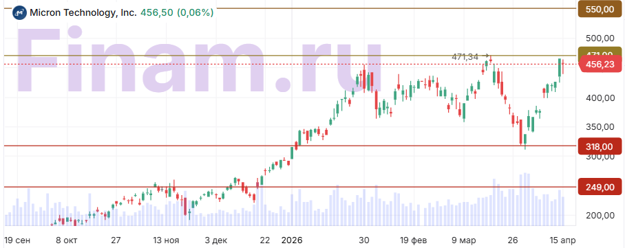 Акции Micron торгуются в боковом диапазоне $318–471 и сейчас находятся на уровне $456,2. Закрепление цены выше сопротивления $471 станет сигналом для роста в диапазон $471–550. В то же время пробой поддержки вблизи $318 существенно повысит риск более глубокой коррекции с потенциальной целью в районе $249.