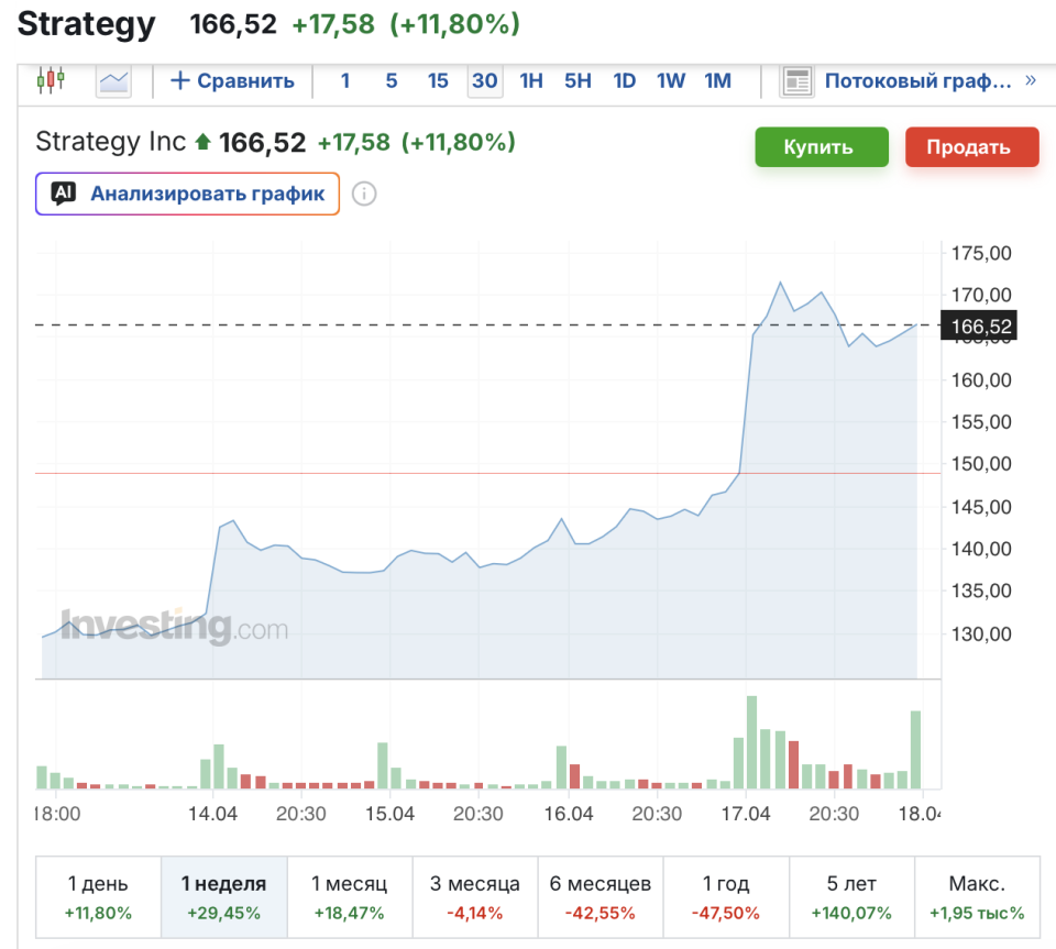 По данным Investing, на фоне объявления об изменении дивидендной политики акции MSTR выросли почти на 12% — до $166,52. За месяц рост составил 29,45%, а средний дневной объем торгов увеличился более чем вдвое за последние три месяца.