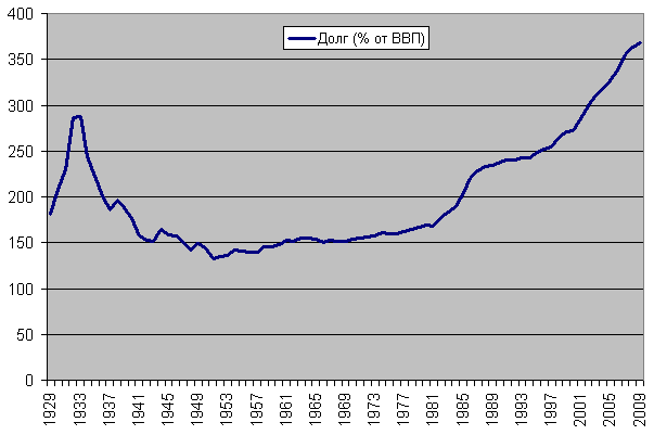 - Тут хорошо видно, как перед Великой Депрессией долг взлетел вверх, и всем известно, чем сопровождался процесс его снижения. Отсюда вполне обоснованные опасения - нынешнее соотношение еще хуже и падать есть куда. Однако, это лишь одна сторона медали. Яркая, но не вся. Всякий долг, как известно, это еще и чей-то актив. Если компания А должна компании Б триллион долларов, и компания Б должна компании А триллион долларов, то общая сумма долгов может быть и впечатляющей, однако проблемы в этом никакой нет. Таким образом, необходимо разобраться, кто кому и сколько должен и на основании этого делать выводы о том, каким образом долги влияют на экономическую ситуацию.