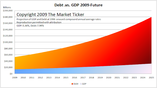 В дидактических целях они построены исходя из смехотворно оптимистических предположений - рост ВВП на уровне 1990/2000 годов (в которые разворачивались Интернет бум и бум недвижимости), рост долга на уровне тех же периодов, (без того резкого ускорения, что мы видим в настоящее время, и будущего ускорения, уже включенного в прогнозы американского правительства и бюджетного комитета) и так далее. И в долг не включены никакие обязательства по пенсионному и медицинскому страхованию.