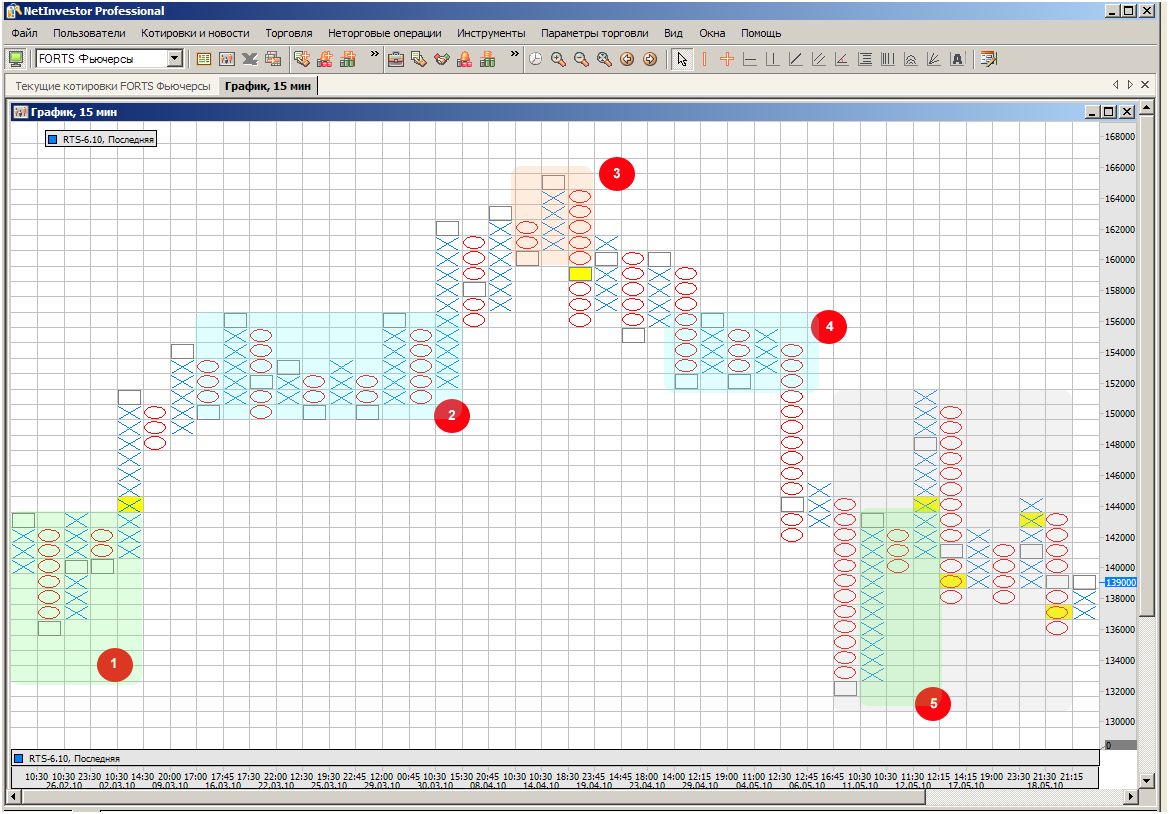 В окне Netinvestor сигналы для совершения сделок помечены желтым цветом. Зона 1 демонстрирует возможность для входа и появляется сигнал на покупку. Зона 2 показывает уровень поддержки. В зоне 3 происходит смена тренда и появляется сигнал на продажу. В зоне 4 уровень сопротивления пробивается. Зона 5 – закрытие позиции. Серая область говорит о повышенной волатильности на рынке и сообщает о большем риске при появлении сигнала.