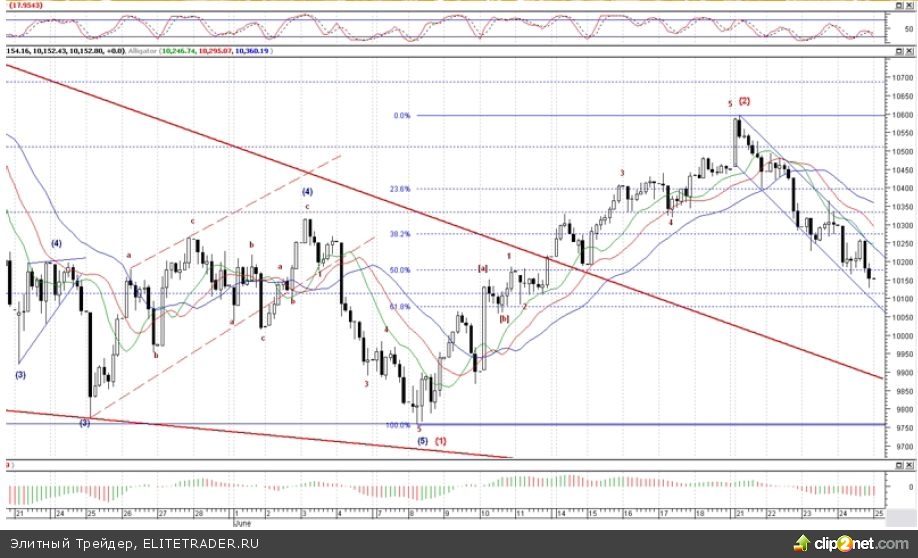 С среднесрочной волновой точки зрения индекс Dow Jones завершил формирование начального диагонального треугольника, который рассматривается как 1-ая волна. Сейчас идет/завершился отскок, район 10350-10500-10690 пунктов на 1-3 недели в рамках 2-ой волны. Так индекс Dow Jones сформировал зигзаг «abc», где 21 июня была сформирована 5-ти волновка в рамках волны с. Окончательное подтверждение завершения 2-ой волны после 10058 пунктов. Альтернативный сценарий допускает, что будет усложнение отскока и сейчас идет коррекция подскока к 10280-10170-10110 пунктов, после чего еще раз наверх, а потому уже 3-ая волна. На месячном графике индекс находится в продаже, на недельном «медвежья» дивергенция, а индекс в покупке. Напоминаем, что «быки» достигли уровня 11245 пунктов, что составляет 61.8% по Фибоначчи от всего падения, поэтому сейчас может идти разворот и начало волны С.