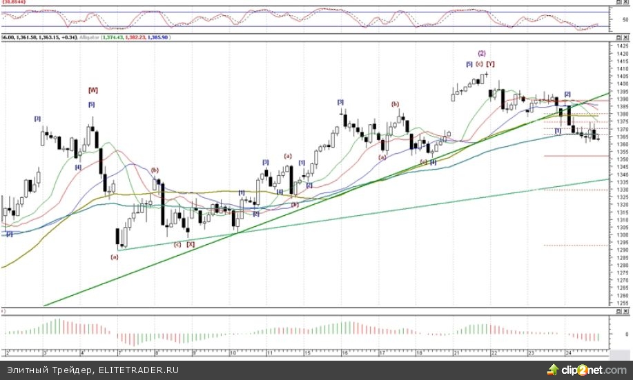 С технической точки зрения, индекс ММВБ продолжил снижаться в направлении первого важного рубежа на отметке 1352 пункта, которая подтверждает истинность выхода из восходящего канала, и где также расположен низ 4-ой малой волны. Второй рубеж находится на отметке 1343 пункта, причем стоит отметить, что фьючерс на индекс РТС прошел аналогичные уровни, поэтому индекс ММВБ также должен продолжить снижение. Индекс ММВБ мог завершить формирование большого отскока в виде 2-ой волны, но желательно подтверждение в виде прохождения вышеуказанных уровней, но предварительными расчетными целями будут отметка 1353 пункта, далее 1329.5 и 1294 пунктов. Если акции не пройдут 1323 пункта, то будет тройной зигзаг в рамках 2-ой волны.