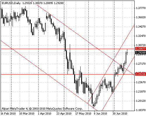 В итоге прошедшей недельной сессии евровалюта прибавила в весе 400 пунктов или 4% против своего основного конкурента доллара и тестировала ключевой уровень сопротивления – ценовую отметку в 1,3 долларов за евро, максимум цены с начала мая этого года. Что ожидать на следующей неделе читайте в статье «ПЕРСПЕКТИВЫ» на следующую неделю