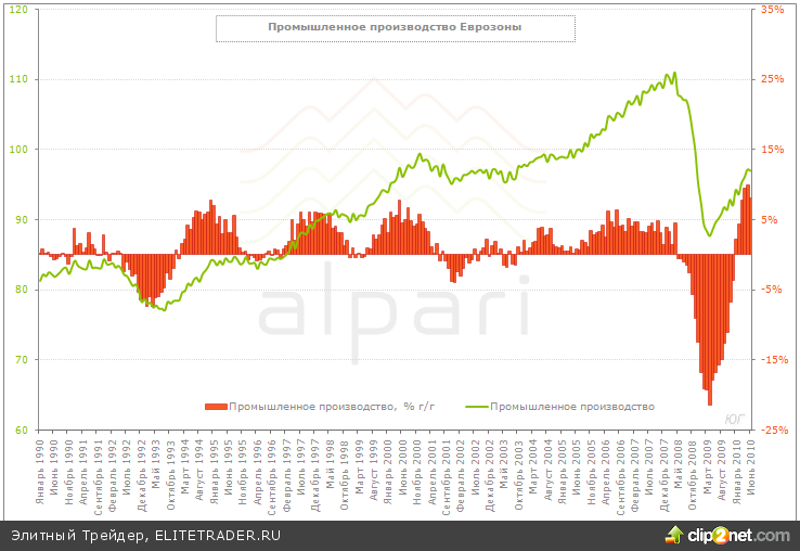 Промышленное производство в Еврозоне за июнь сократилось на 0.1%, ждали роста показателя, за последний год европейская промышленность прибавила 8.2%, что ниже майских 9.9% и является минимумом за три месяца. Евросоюз в целом зафиксировал отсутствие роста производства в июне, годовой прирост составил 7.7%. В июне производство упало в следующих странах: Голландия (-3.1%), Франция(-1.6%), Греция (-0.7%), Германия (-0.5%), Португалия (-0.5%), Испания (-0.3%), Латвия (-0.1%). Остальные страны показывали рост производства. Производство остается на 12.7% ниже своего докризисного максимума и смогло восстановить около 2/5 кризисных потерь.