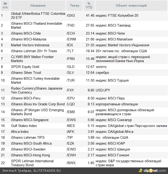 На данный момент существует более 1000 различных ETF в США, и их количество продолжает увеличиваться. Сейчас можно встретить ETF, относящиеся к различным сегментам финансового рынка: рынку акций, облигаций, биржевых товаров (коммодитиз) и валюты. Нижеприведенная таблица отражает доходность основных ETF с начала 2010 года: