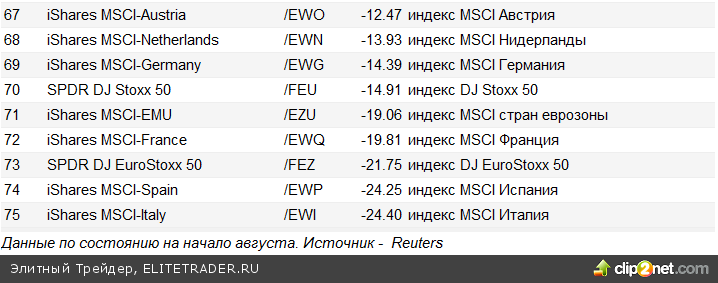 По таблице нашего доходностей можно судить, что в августе расстановка сил на мировых фондовых рынках мало изменилась - в лидерах по доходности остался примерно тот же перечень развивающихся стран второго эшелона, а в аутсайдерах - все та же Европа. Основное заметное изменение заключается в том, что самым прибыльным фондам удалось за август нарастить свою доходность, а самым убыточным - нарастить убытки.