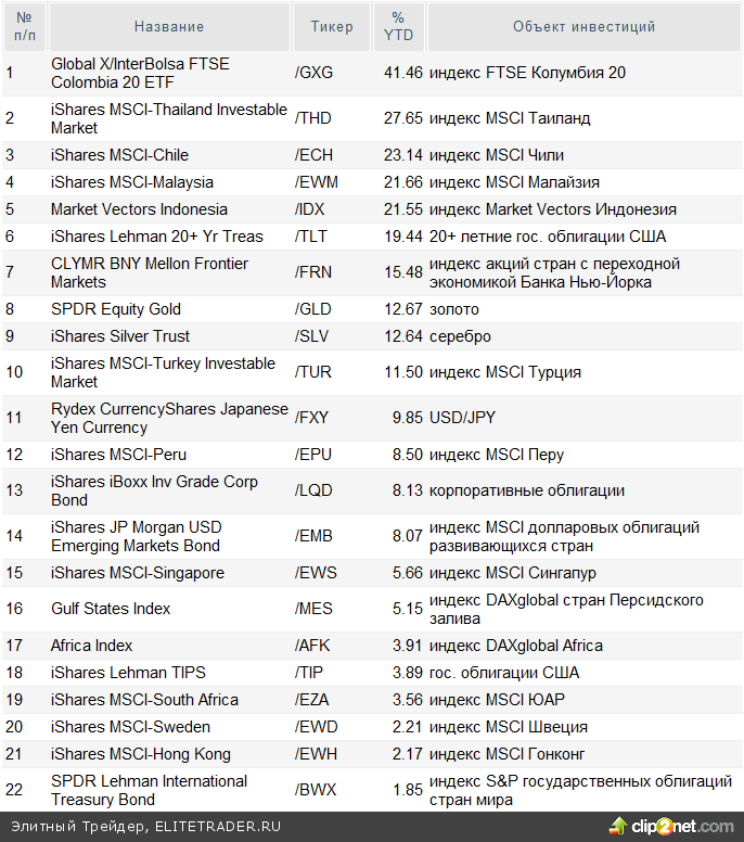 На данный момент существует более 1000 различных ETF в США, и их количество продолжает увеличиваться. Сейчас можно встретить ETF, относящиеся к различным сегментам финансового рынка: рынку акций, облигаций, биржевых товаров (коммодитиз) и валюты. Нижеприведенная таблица отражает доходность основных ETF с начала 2010 года: