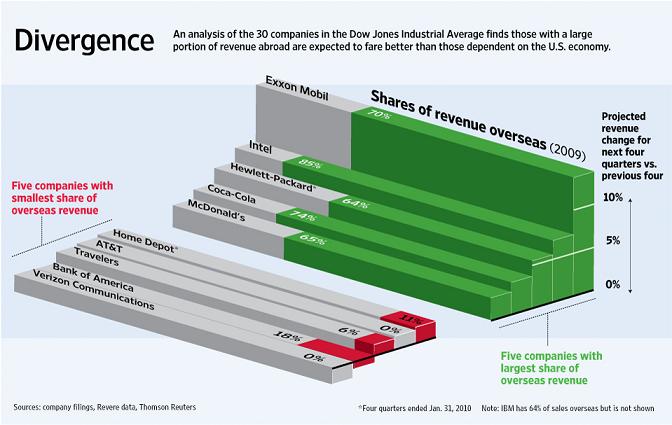 Развивающиеся страны будут развиваться быстрыми темпами, в то время как США вряд ли вернутся к быстрому росту в ближайшее время. “Такая двойная тенденция будет продолжаться и дальше”, - считает Джозеф Квинлан (Joseph Quinlan), стратег в U.S. Trust. У Coca-Cola Co., работающей на международном рынке с 1920-х годов, три четверти продаж за границей. США до сих пор остаются крупнейшим рынком для компании, и в перспективе продажи в США будут расти. Однако Джон Фаррелл (John Farrell), руководитель глобального стратегического планирования, заявляет, что компания позиционирует себя в мире уже не как американская компания, у которой есть бизнес за рубежом, а как глобальная организация, у которой рынок США находится среди сотни других.