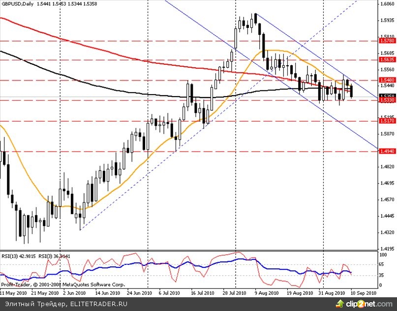 Пара находиться в верхней половине нисходящего канала, построенного по максимумам 9 августа и 8 сентября, а так же минимуму 24 августа 2010 года. Ключевым для пары является диапазон 1,5330 – 1,5480. В случае пробития 1,5480 ориентиром для пары станет уровень 1,5635, а далее отметка 1,5780. В случае же пробития 1,5330 пара проверит на прочность уровень 1,5170, а далее 1,4940. Скользящие средние на недельном и четырехчасовом графиках указывают на снижение, а на дневном таймфрейме на боковое движение пары. RSI на недельном и дневном таймфреймах нейтрален, а на четырехчасовом графике указывает на незначительную перепроданность пары. Мы занимаем медвежью позицию по данной валютной паре и рекомендуем ее к продаже при прорыве к 1,5480.
