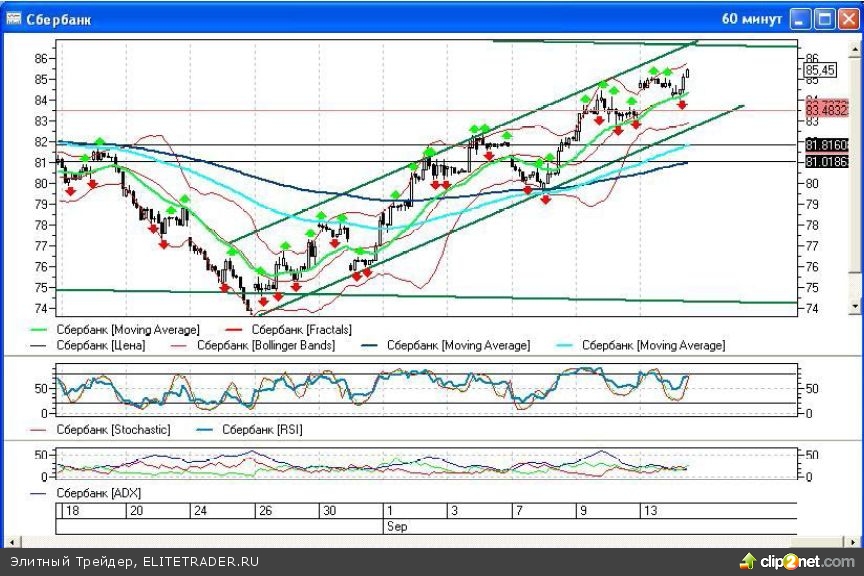 Бумаги «Сбербанка» в рамках повышательного канала (я смотрю на часовик) могут подняться до 86-86,5 рублей, там их должна встретить линия сопротивления, проведенная по максимумам 20.01, 18.03, 15.04 и 03.08.