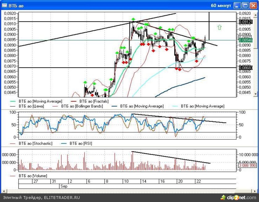 Если акции пробьют данный «треугольник» наверх, то рост продолжится до уровня 0,0935 рублей, на величину заходящей в «треугольник» волны. На данный момент я вижу попытки пробоя данного сопротивления, осциллятор RSI на своём графике уже торгуется выше линии сопротивления, проведенного по пиковым значениям 13 и 21 сентября, для подтверждения пробоя нам не хватает только объемов торгов