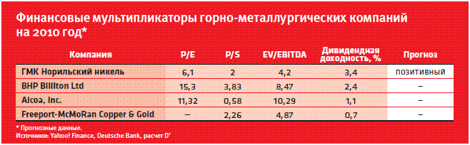 В сравнении с нефтяными и газовыми компаниями перспективы акций ГМК "Норильский никель" намного выше. Во-первых, в отличие от той же нефти, на рынках меди, платины и палладия цены вернулись к уровню 2008 года, что крайне позитивно сказывается на результатах "Норникеля". Сейчас компания возвращается к былым показателям рентабельности, и самым серьезным катализатором для роста (или падения) является конфликт между Владимиром Потаниным и Олегом Дерипаской. "Русал" и "Интеррос" владеют по 25% акций "Норникеля", и для них главный вопрос – дивиденды и места в совете директоров. Кроме того, негатива добавила и угроза премьер-министра РФ Владимира Путина вернуть пошлины на никель, но не настолько серьезно, чтобы это стало критичным для инвестиционной привлекательности акций ГМК.